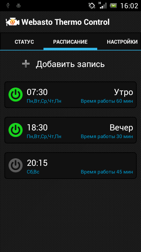 да нет у меня проблем с котлом. работает. программирование галимое. вот как должно быть: выбрал 5 дней недели, и выбрал два времени: 8:00 и 18:06. и ВСЕ! забыл об этом вопросе. Это значит мне нужна теплая машина к этим временам и только в рабочую неделю. И мне по-барабану сколько она будет работать. Есть температурные датчики (улицы, движка, салона) и машина сама решала за сколько ей запустить вебасту. И сама ее не запускала если на улице больше +15 и прочим параметрам. для принудительного запуска "прям сейчас" отдельный пункт меню. Для разового запуска отдельный пункт в меню. для дистанционки был пульт (полный внешний аналог супербовского) |